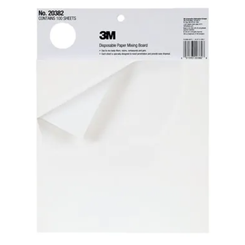 Use the 3M™ Disposable Paper Mixing Board as a cleaner, more cost-effective option. Each board contains 100 tear-off sheets of clean paper - a new mixing surface each time you prepare filler. These sheets are free of impurities commonly found in materials like cardboard, which can contain waxes, fibers and other contaminants that can break down when exposed to solvents, making the filler less stable and more likely to fail. Unlike cardboard, these 25 cm x 27.5 cm paper sheets are non-porous and won’t react with solvents common in many body fillers. This means no contamination of the filler. When mixing is done, simply tear the sheet off for a fresh mixing surface to save clean-up time.