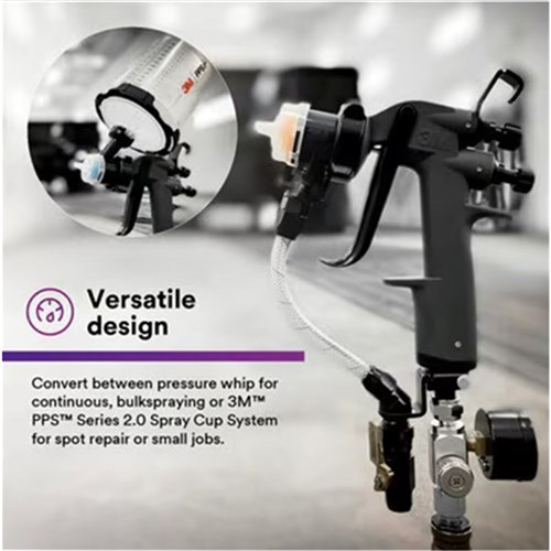 With its versatile design, technicians can spray from either a pressure or gravity sources. The pressure-fed hose and nozzles allow for continuous bulk spraying for larger jobs. Or for spot repairs and small areas, convert the spray gun to use the 3M™ PPS™ Series 2.0 Spray Cup System – so you use just the right amount of coating to match the size and finish of the job.