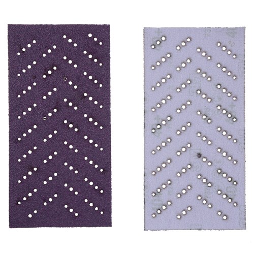 Features 3M Precision-Shaped Grain, triangular-shaped grains that cut at least 30% faster and last at least 30% longer than other conventional ceramic abrasives. Clean Sanding multi-hole pattern delivers excellent dust extraction. 3M Hookit hook-and-loop style abrasive attaches firmly, removes quickly for fast change-out. Kiss-cut scoring technology allows for use in multiple sheet lengths. Sharper cutting surface means less pressure is required. Grains are electrostatically oriented on abrasive surface for efficient cut.