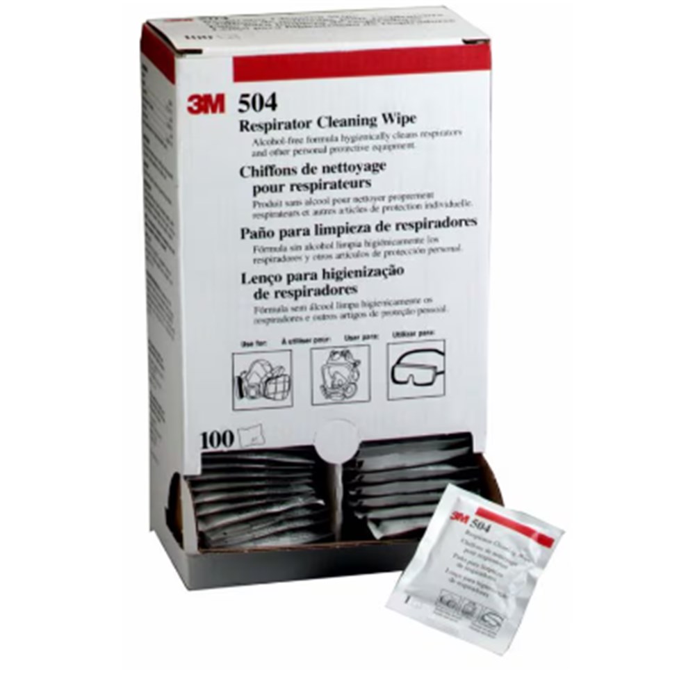 3M 504 Respirator Cleaning Wipes are designed to clean the surface dirt and deposits from a used half or full face respirator. Pre-moistened towelettes for hygienically cleaning reusable respirators. Alcohol free and individually packaged in sealed sachets. Uses Benzalkonium Chloride. 100 wipes/box.