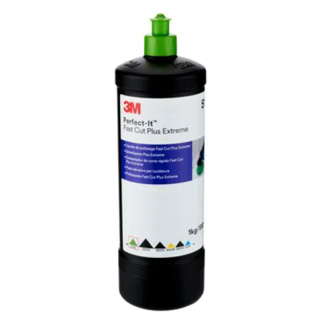 3M Perfect-It Fast Cut Plus Extreme is a fast cutting abrasive liquid compound designed to quickly remove sanding scratches after flatting or denibbing process with 3M 260L P1500 then Trizact 3000. Use with green pad of the 3Ms colour coded compound range. Exceptional fast cut-rate performance. 20% to 25% less product required than standard Fast Cut + / XL to polish the same area. Superior high gloss finish. Remove overspray.