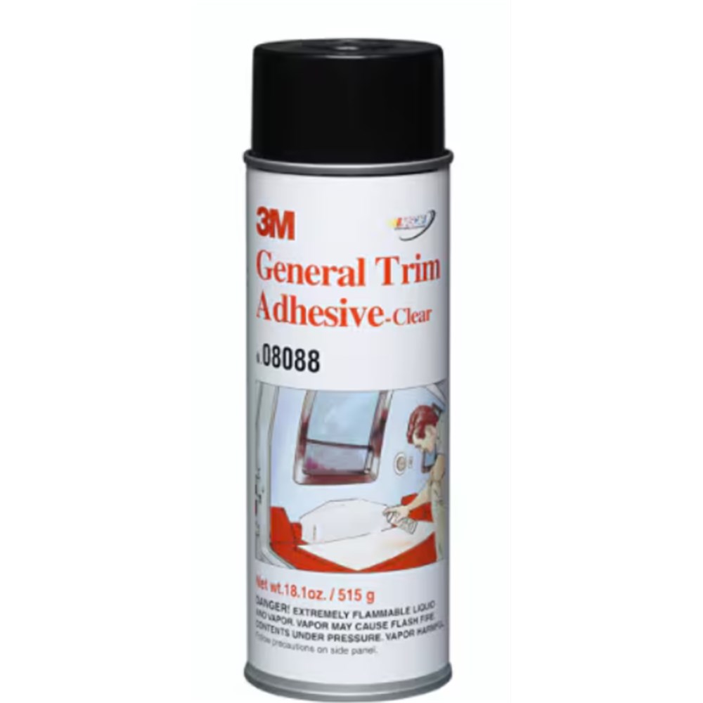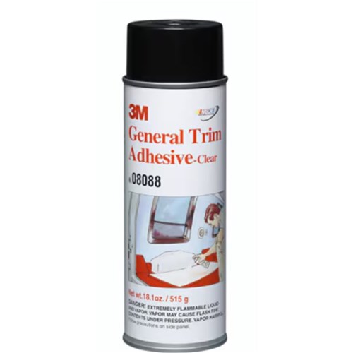 3M General Trim Adhesive bonds automotive materials such as carpeting, vinyl, fabrics, and plastics to metal and other hard, impervious surfaces. Our high-strength adhesive offers good heat and water resistance. Recommended for bonding carpet fabric and plastic to metal. Secure bonding to hard, impervious surfaces. Aerosol adhesive offers easy application. Dries to a clear color for a low profile appearance.