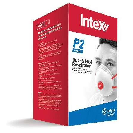 Intex P2 valved dust masks. The P2 respirator is equivalent to the USA standard N95. Respirator mask certified to AS/NZS 1716:2012. Protection from dusts, mists and fumes. Twin strap with comfort nose bridge to minimize leaks. Large exhalation valve increases comfort. Three layer technology for strength and longer life.