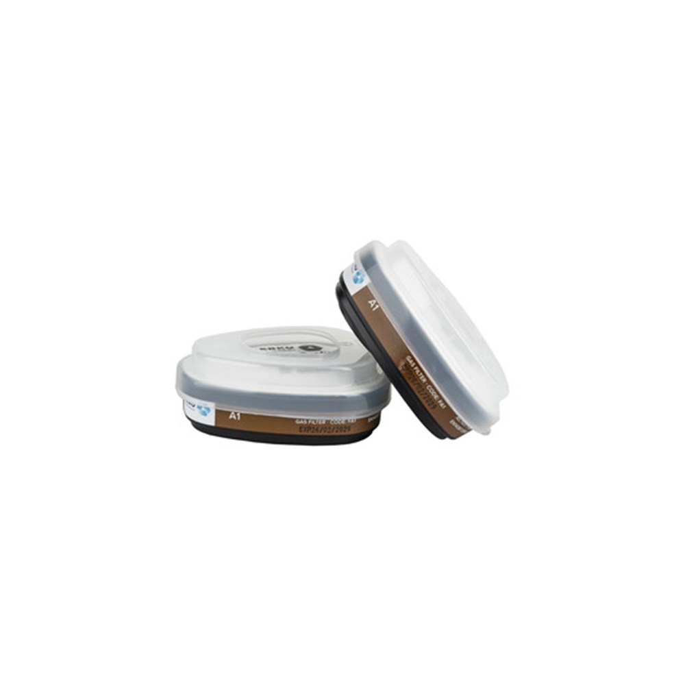 Gas filter A1, 2 pieces in a sealed plastic bag. The filters comply with EN 14387 and are CE-certified. CE marking: 0082.