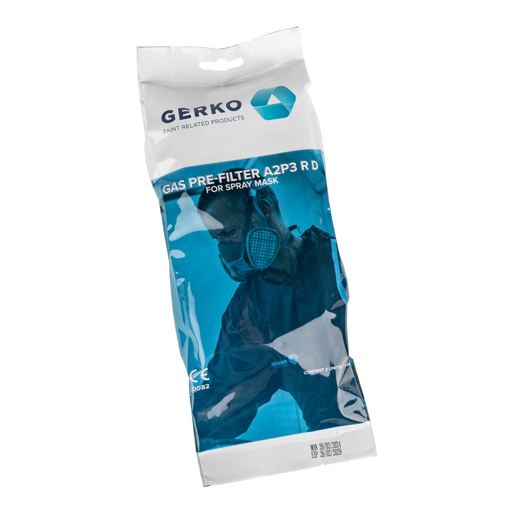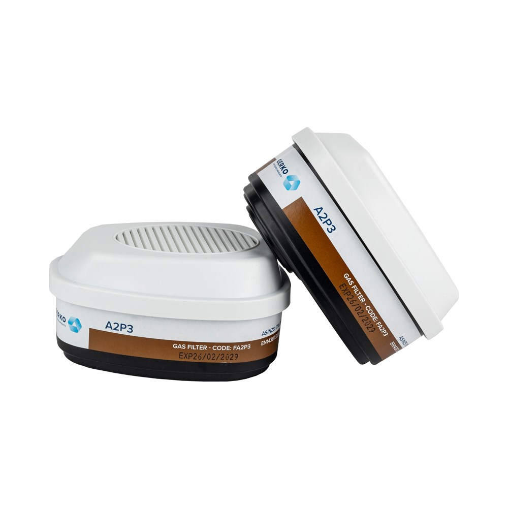 Gas filter A2P3 R D, 2 pieces in a sealed plastic bag. The filters comply with EN 14387 and are CE-certified. CE marking: 0082.