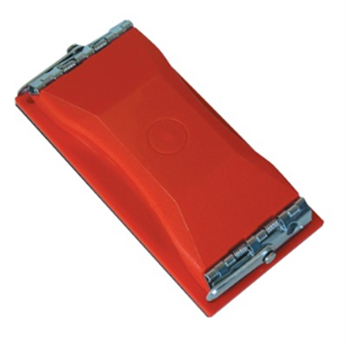 Ergonomic hand sander. Comes with a clamp style clip on each end to hold your sand paper in place. Very comfortable and solid grip for when sanding for long periods at a time.