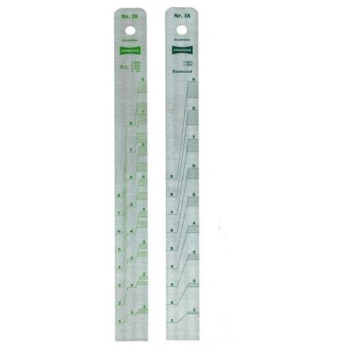 Standox mixing stick. Front- 2:1 + 5 / 10 / 15 / 20%Back- + 50 / 60%